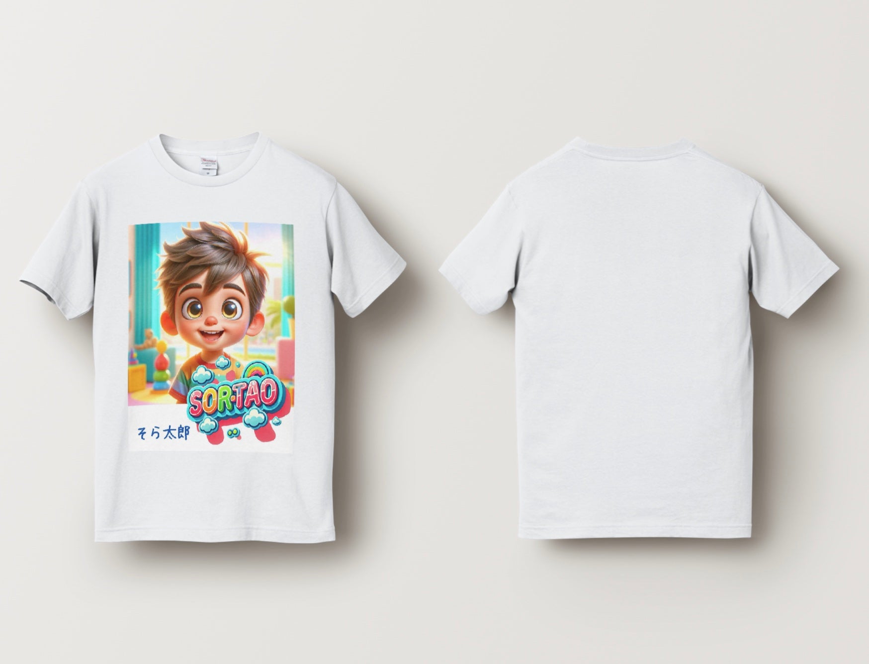 ぼく、そら太郎のオリジナルTシャツが新登場!元気いっぱいのイラストと、カラフルな「SORTAO」ロゴがポイントだよ♪ お出かけやおうち時間も、これを着れば気分はハッピー!おそろいで着ようよ〜!